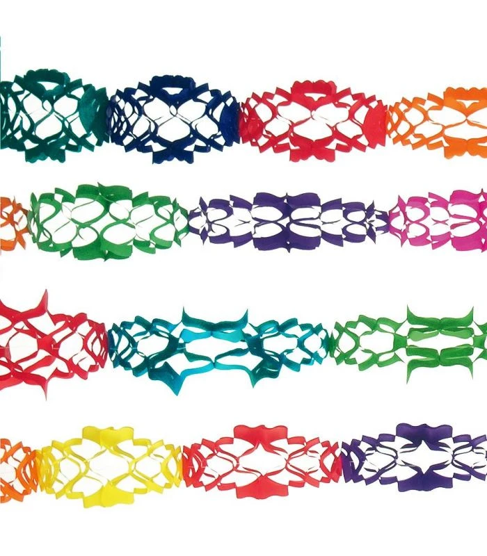 10 festoni in carta colorata in modelli assortiti, lunghi mt. 3, molto allegri e colorati, per festeggiare ogni vostro party in allegria.