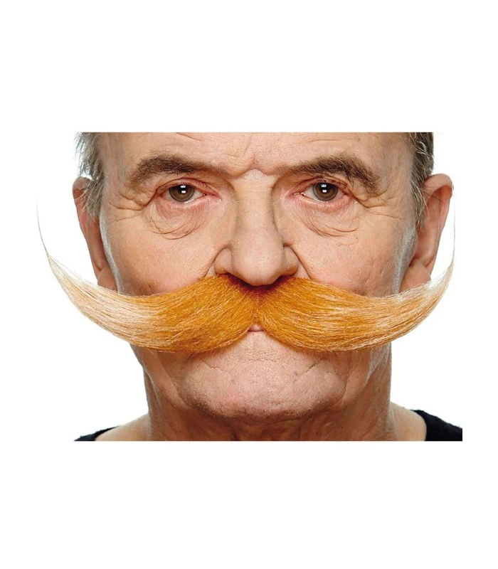 Baffi Lunghi a Punta biondi Professionali . Pratici e di sicuro effetto ti trasformeranno in un attimo nel personaggio da te desiderato , per una rappresentazione teatrale o per un semplice scherzo con gli amici