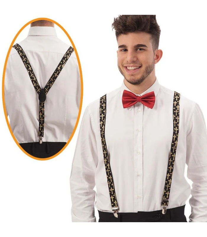 Bretelle con croci glitterate in oro. Un accessorio ideale per un look semplice stile Halloween.