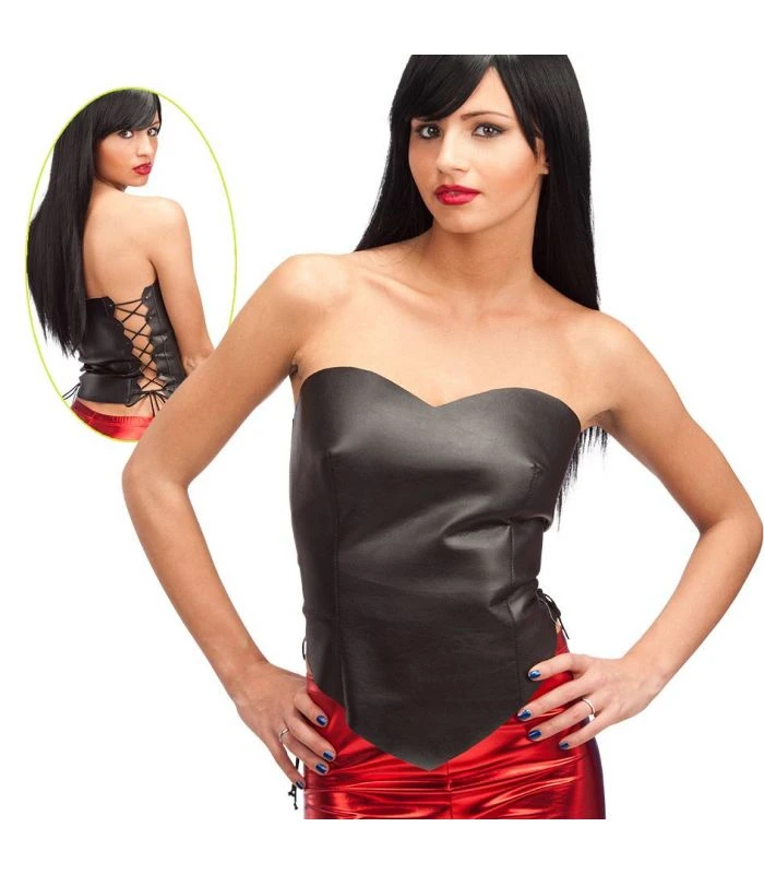 Bustier in ecopelle color nero. Taglia unica. Con laccetti laterali e una scollatura a forma di cuore. Adatto per vari travestimenti.