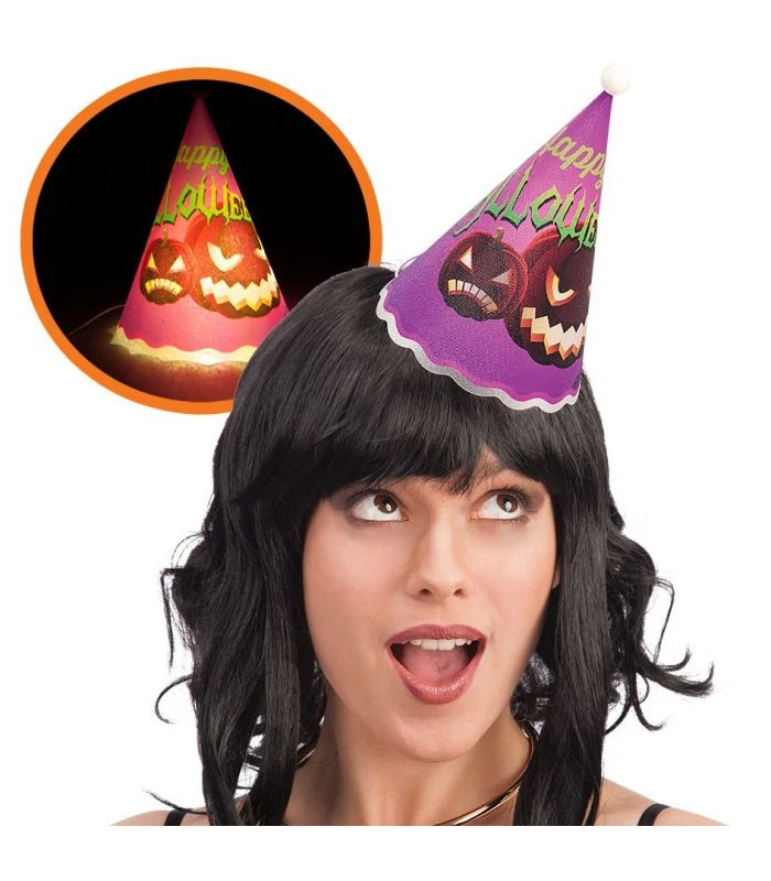 Accendi la tua festa di Halloween! Un cappellino per party di colore viola che si illumina, come si illuminerà la tua festa. Batterie incluse.