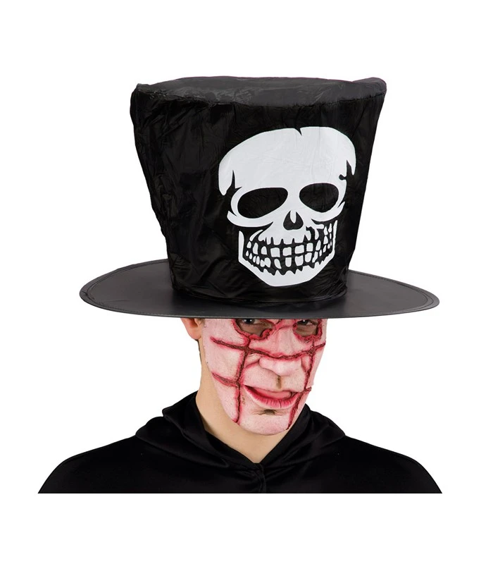 Cappello in tessuto plastificato nero con teschio alto 20 cm.