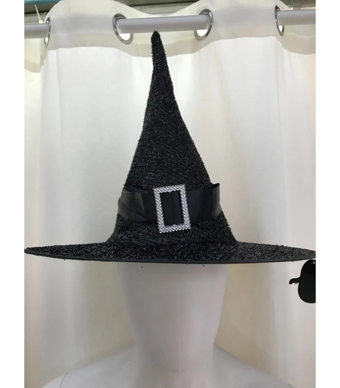 CAPPELLO STREGA LUCCICANTE FIBIA NERA IN TAGLIA UNICA DA ADULTO , ADATTO PER TRAVESTIMENTI DA STREGA E PER COSTUMI DI HALLOWEEN , COMPLETA IL TUO TRAVESTIMENTI CON QUESTO CAPPELLO DA STREGA ..