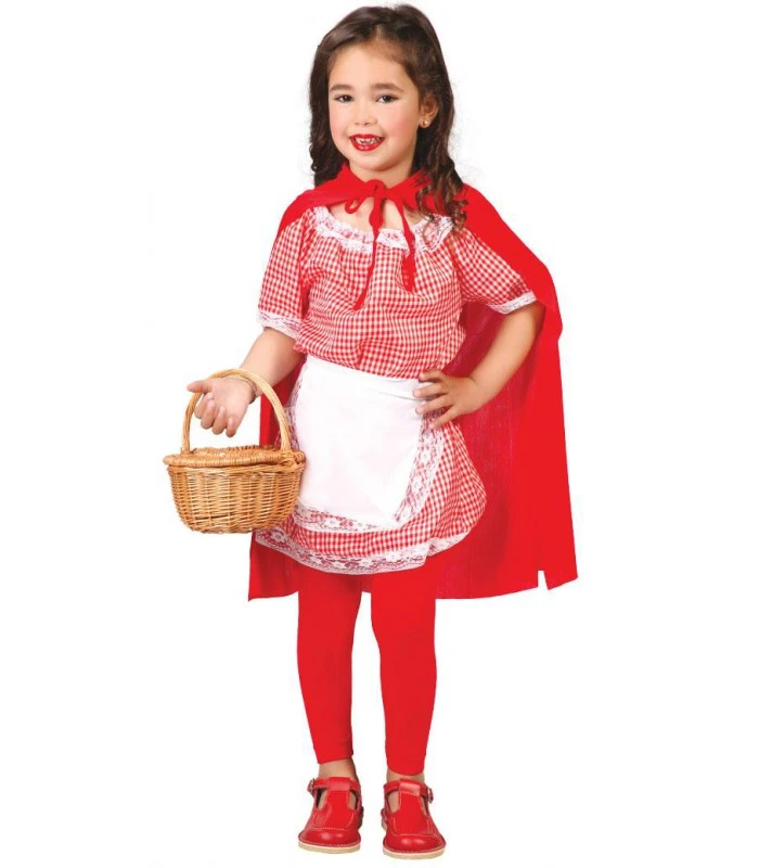 Costume Cappuccetto Rosso, un travestimento evergreen per bambine di 5-6 anni (h. 110-115 cm.) con mantella e cappuccio, vestito e grembiulino. Un costume adatto a recite scolastiche.
