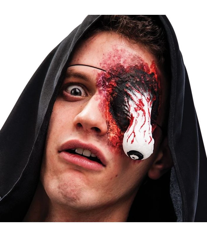 Cicatrice con ferita e occhio fuori dalle orbite per impersonare un terrificante zombie la notte di Halloween.