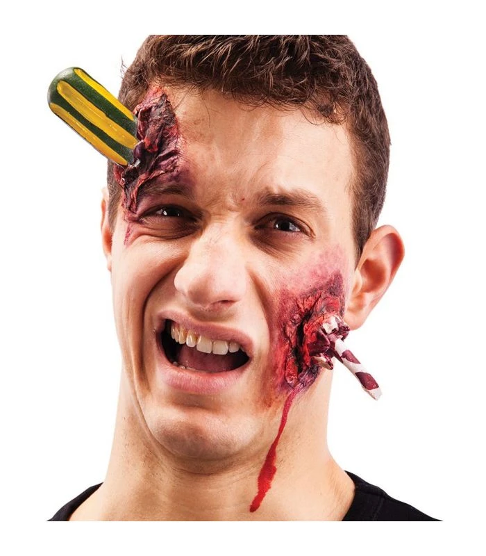 Cicatrice con cacciavite infilzato suddivisa in due parti, una con il manico e una con la punta e dotata di colla per fissarle.