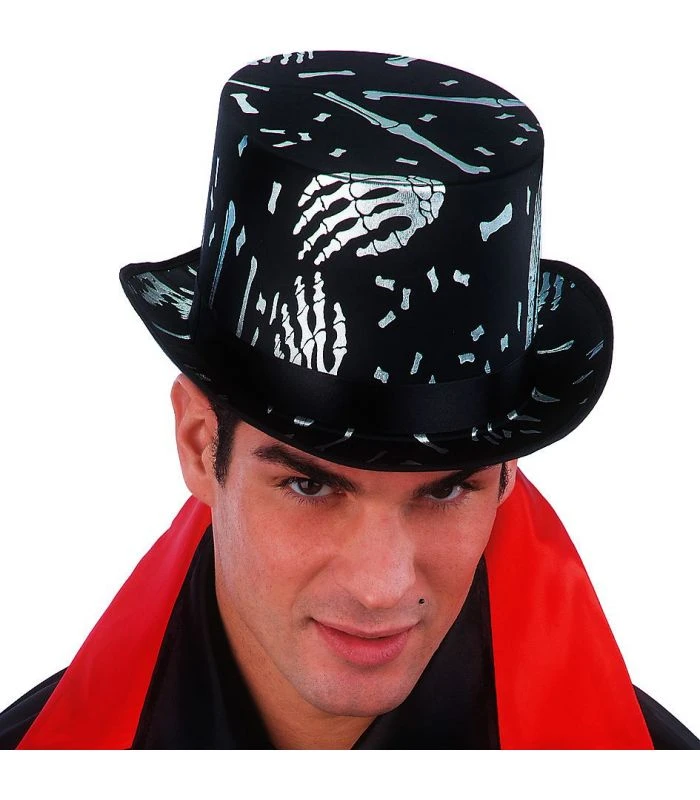 Cilindro in raso nero con decorazioni argento raffiguranti mani scheletriche e ossa, altezza cm. 12 ca, adatto per feste horror e travestimenti stile Halloween.