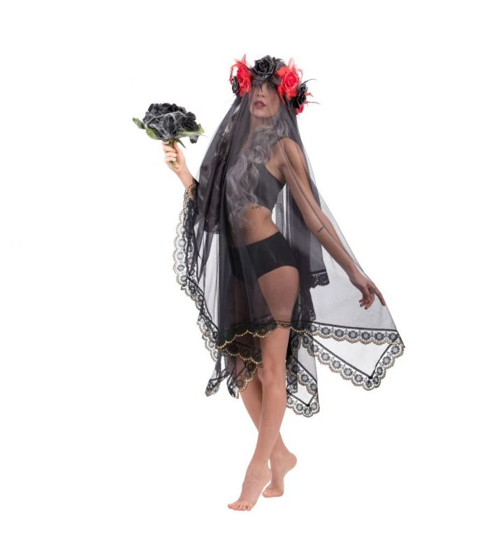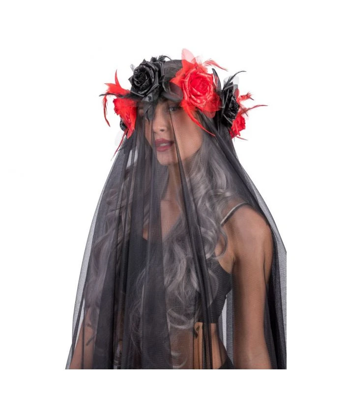 Copricapo con rose e veletta trasparente, lunghezza cm.135 ca., per un vedo non vedo intrigante e misterioso. La notte di Halloween potrai interpretare una sposa funerea o una fata sexy e malvagia , adatto anche per feste di carnevale e travestimenti a tema ..