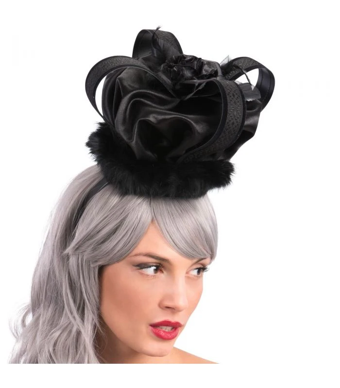 Corona nera in raso e pelo che si indossa comodamente grazie al cerchietto applicato. Un accessorio esclusivo per un look regale.