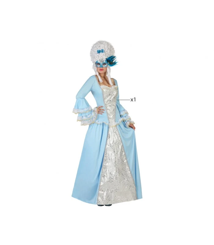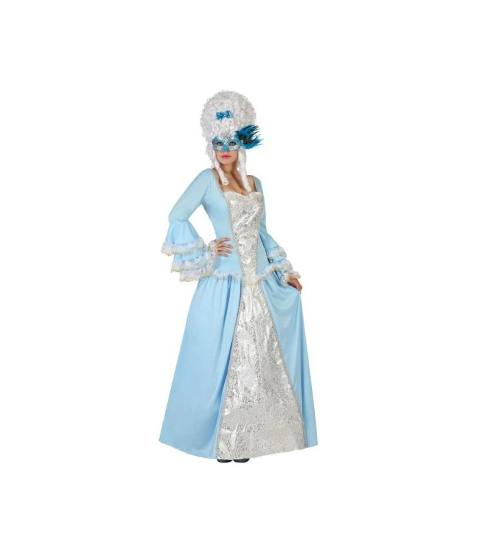 Costume Cortigiana Azzurro lungo in taglia unica M . Costume completo esclusa maschera e parrucca che potrai trovare sul nostro sito spaziando tra innumerevoli modelli e colori . Usatissimo per rievocazioni storiche o feste di Carnevale dove l’eleganza regna sovrana !