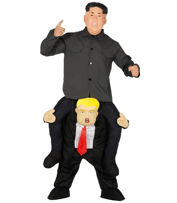 COSTUME SIMPATICO A CAVALLO DI TRUMP , VESTITO CHE COMPRENDE IL PANTALONE ELASTICIZZATO CON LA FACCIA DI TRUMP CHE PORTA A CAVALLUCCIO E MAGLIETTA DA KIM .. ( MASCHERA IN LATTICE DI KIM A PARTE ) .. ADATTO PER TRAVESTIMENTI SIMPATICI E PER FESTE DI CARNEVALE