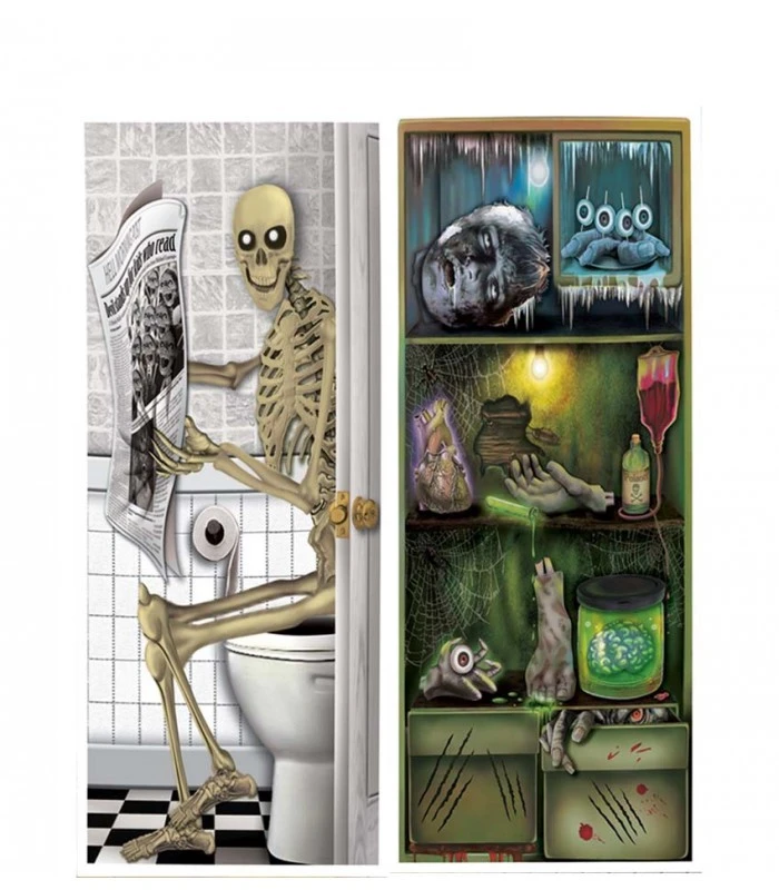 DECORAZIONI ASSORTITE 75 X 150 CM DI HALLOWEEN CON FANTASIA WC E FRIGORIFERO , ADATTE PER ALLESTIRE SALE A TEMA HORROR E NON SOLO .. UN ARTICOLO IN PIU’ PER ALLESTIMENTI DI HALLOWEEN ..