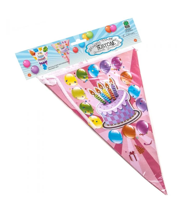 Festone composto da bandierine colorate raffiguranti una torta e palloncini, lungo mt. 2,20, ideale per decorare e abbellire la sala durante i vostri compleanni.
