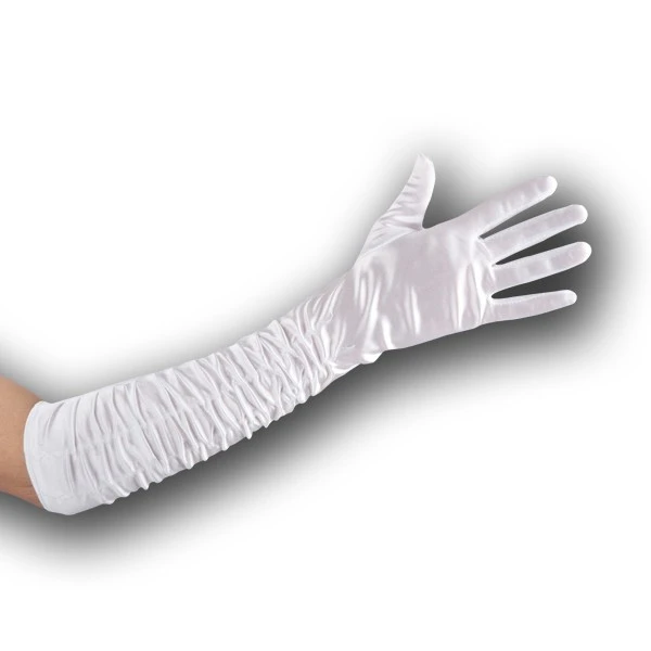 Guanti in raso arricciati bianchi! Articolo di carnevale, originale per le vostre feste a tema e per un travestimento di sicuro effetto, guanti in raso arricciati bianchi da cm 50, che trovate disponibili on line.