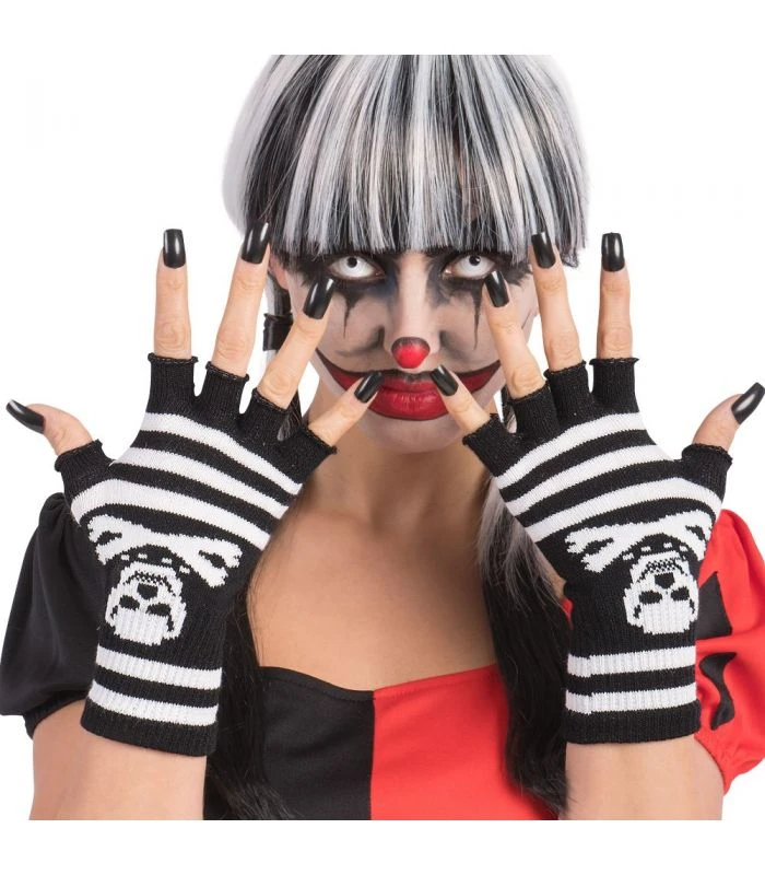 Guanti a metà neri e bianchi di lana con immagine con simbolo teschio. Taglia unica. Accessorio semplice e carino per la festa di Halloween.