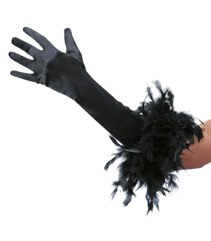Guanti neri di raso con boa, adatto per feste in maschera, feste a tema, spettacoli teatrali, Halloween e Burlesque.