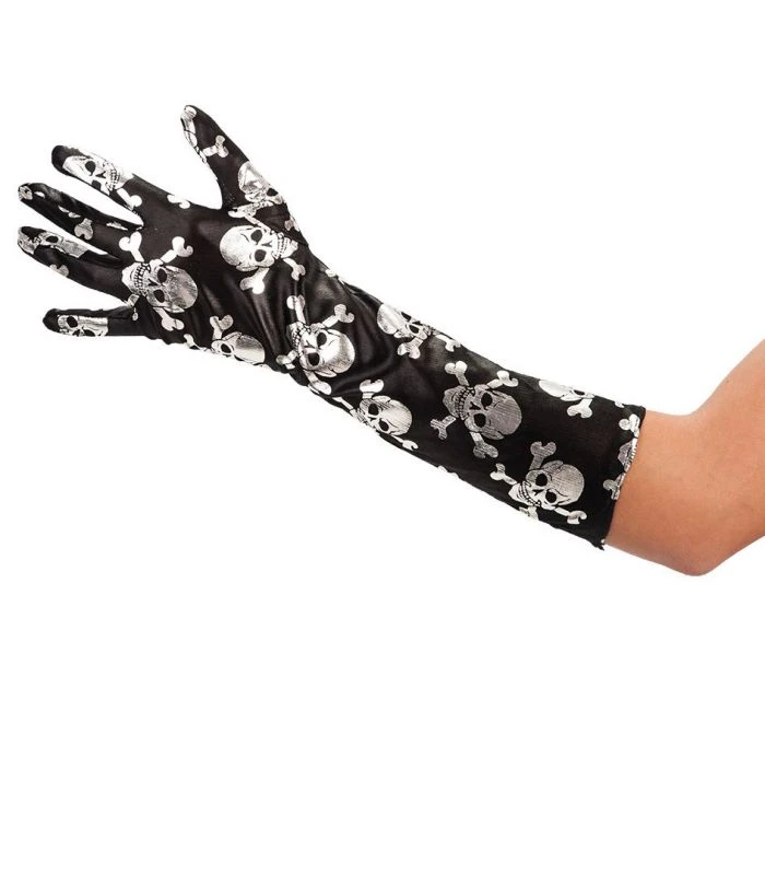 Guanti neri in seta con teschi color argento. Per rendere il tuo look di Halloween sorprendente.