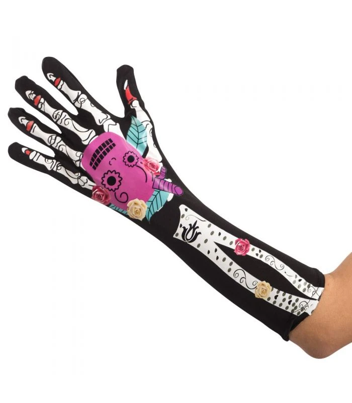 Guanti con teschio messicano stampato e cavalletto. Adatto per vari tipi di travestimenti. Feste a tema, feste in maschera e Halloween.