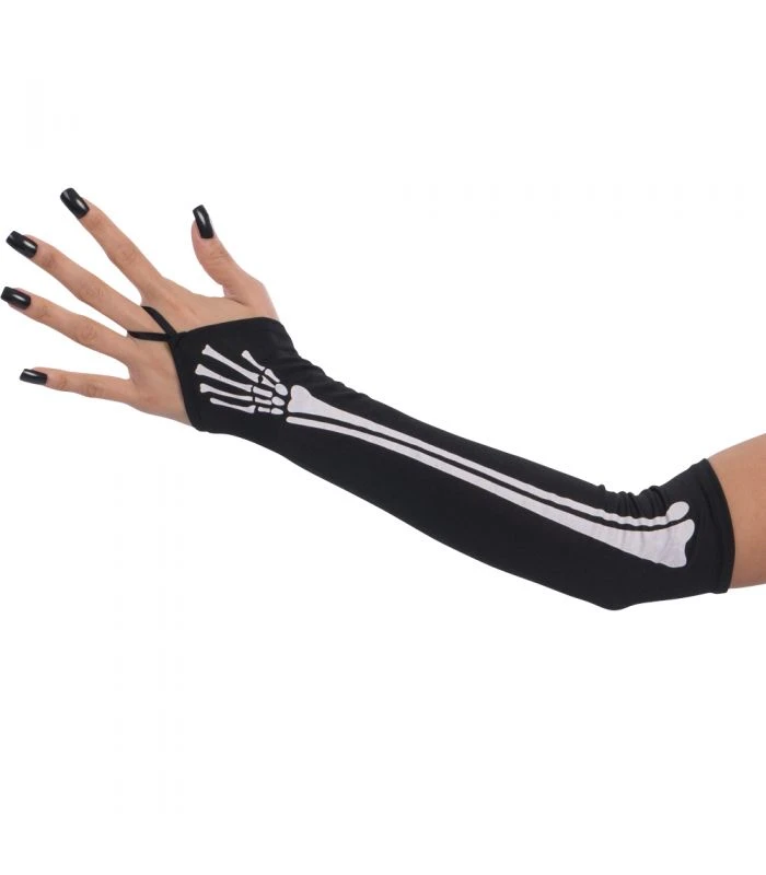 Manicotti modello infradito con stampa ossa scheletro. Adatti per un semplice outfit per la seradi Halloween. Accessorio semplice e originale.