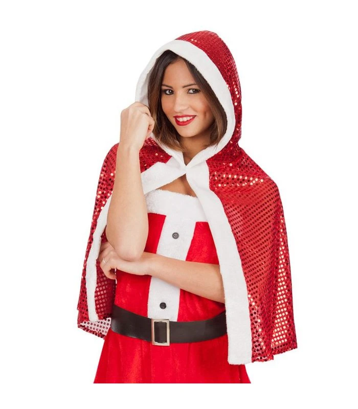 Mantellina Donna Natale in paillettes e bordo in peluche. Taglia unisex. Adatto per un perfetto stile Natalizio.