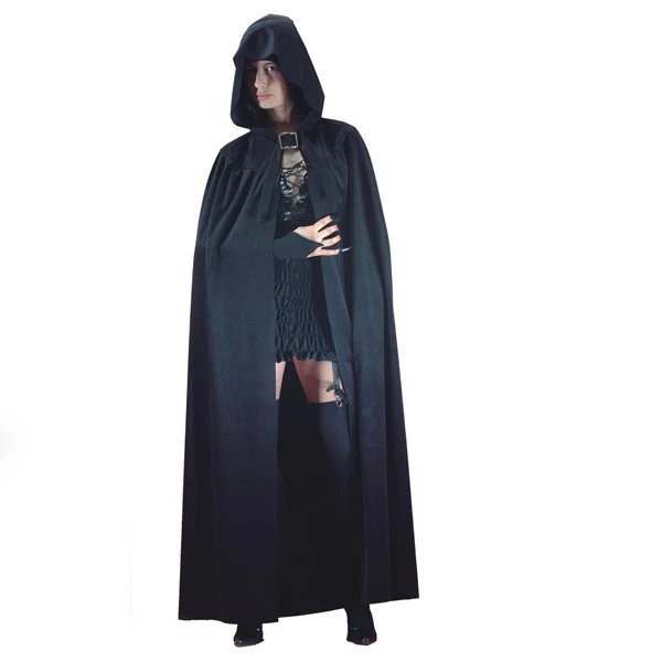 Mantello con cappuccio in dainetto nero, per “lei”…un acquisto molto particolare, perché l’accessorio è praticamente di per sé un costume completo, che potrebbe solo richiedere sotto qualche abito improvvisato.
