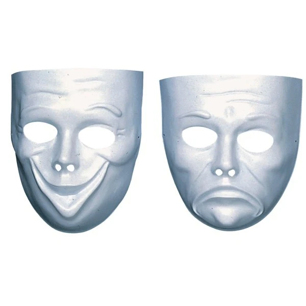 La rappresentazione di una maschera triste ed una felice risale alla commedia dell’arte in cui le maschere principali e piu’ divertenti sono gli zanni. tra gli zanni piu’ famosi abbiamo Arlecchino, Brighella, Steterello e altri. Rappresentano il bianco e il nero, l’allegro (Arlecchino) e il triste (il piu’ famoso e’ Pierrot) e stanno a rappresentare l’ambivalenza teatrale dalla commedia alla tragedia che vede sempre l’uso di una maschera!