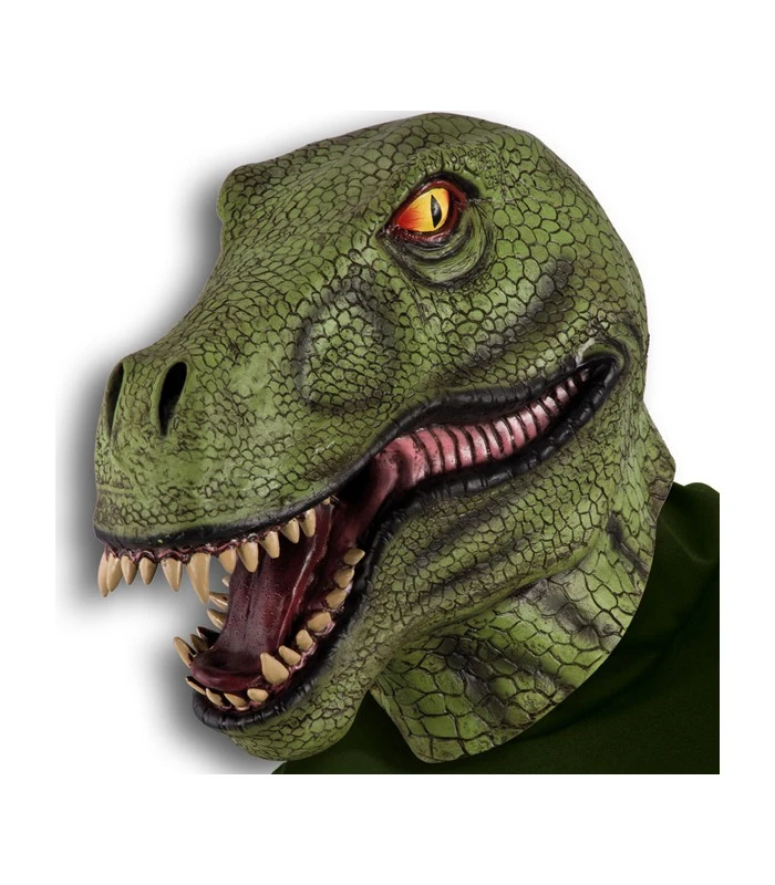 Maschera Dinosauro in lattice di gomma , finemente curata nei particolari espressivi e di colore .