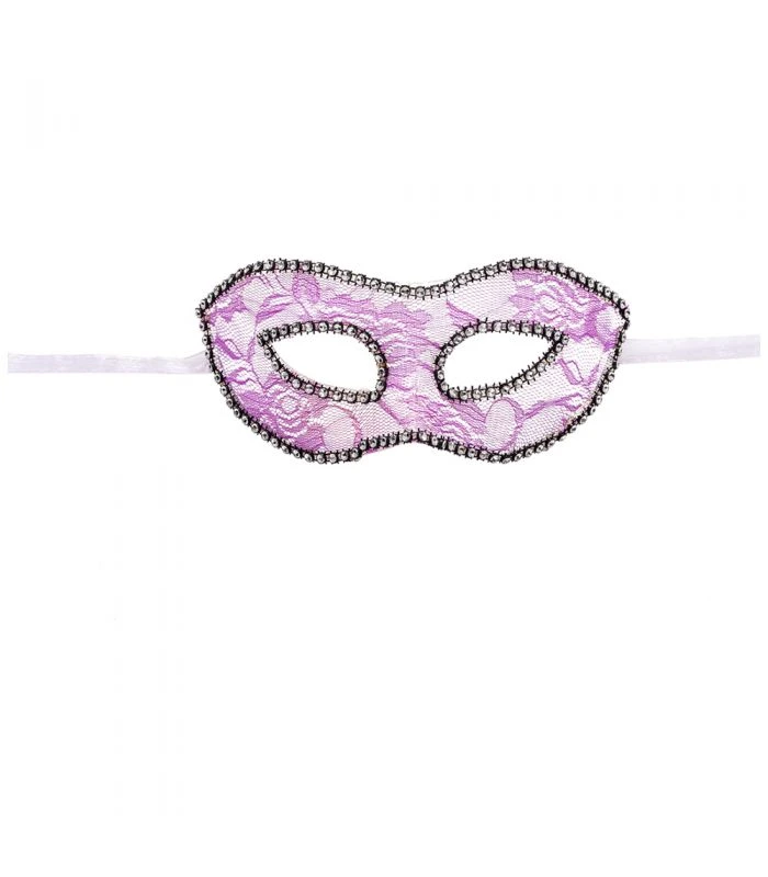 Mascherina per occhi di colore viola chiara in pizzo . Finemente bordata con strass luminosissimi . Per rendere il tuo viso ancora più intrigante a Carnevale o serate di gala dove il tuo look sorprenderà tutti i tuoi amici .