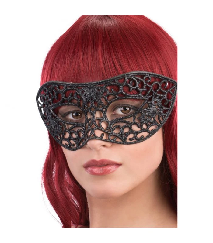 Mascherina mezzo viso in plastica intagliata con glitter neri, ideale per un travestimento elegante per la serata di Halloween o la tua festa in maschera.