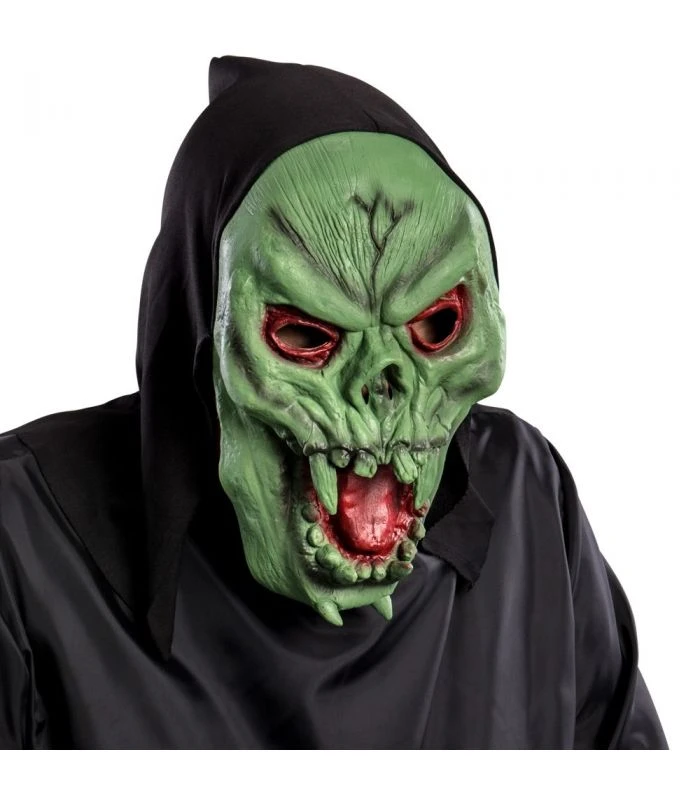 Maschera scheletro verde con cappuccio nero in tessuto . Classica maschera in lattice di gomma per serate a tema Halloween dove il tema è Horror . Si calza facilmente coprendo tutta la testa rendendoti irriconoscibile ai tuoi amici anche in serate di Carnevale