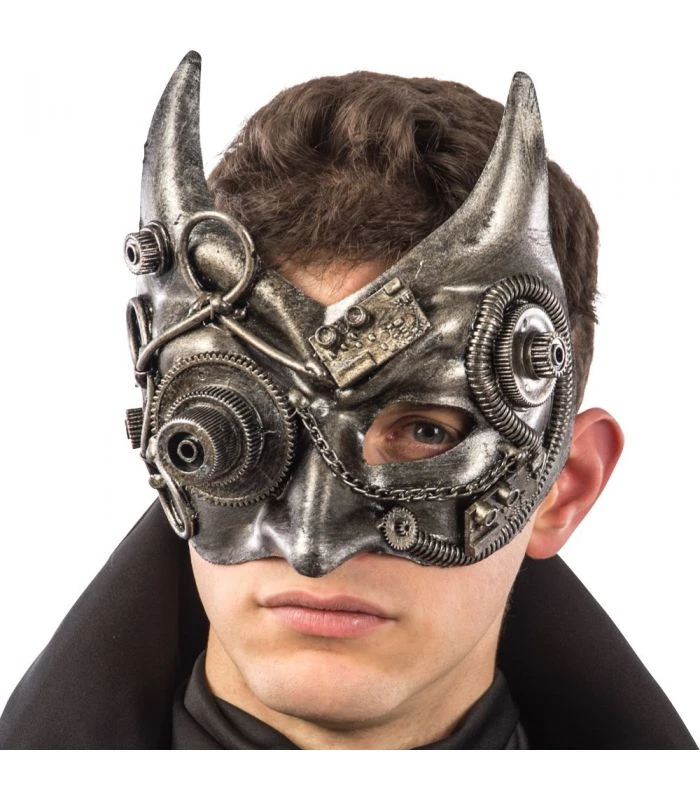 Maschera mezzo viso in plastica colore argento da diavolo steampunk. maschera in taglia unica da adulto adatto per travestiementi di carnevale e non solo ..
