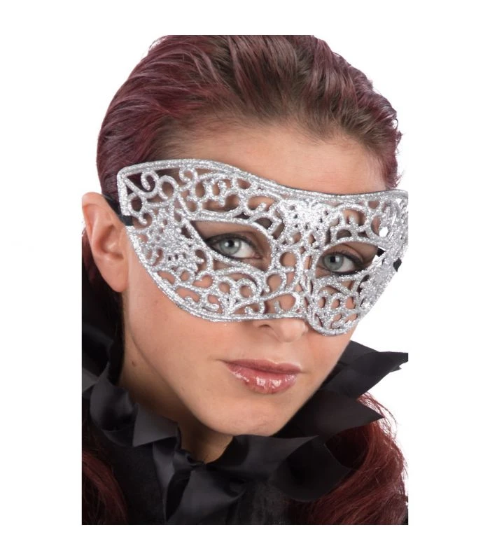 Mascherina mezzo viso in plastica intagliata con glitter argerto, per illuminare il tuo Capodanno o la tua festa in maschera.
