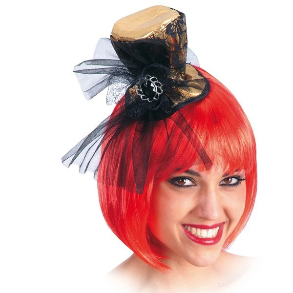 Mini cilindro in oro e pizzo con clip, un articolo di carnevale elegante e sobrio allo stesso tempo, un accessorio ideale anche per spettacoli e danza.