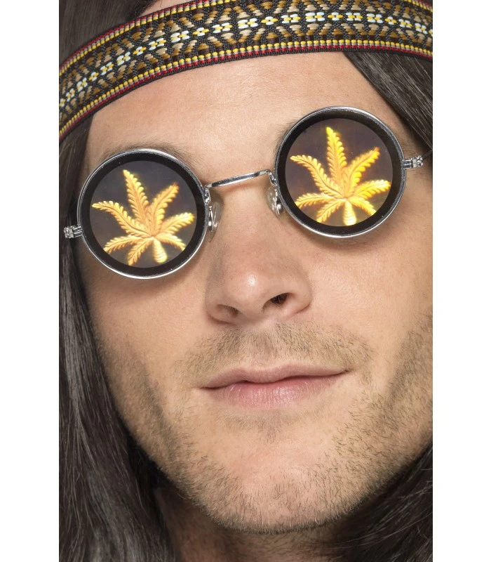 OCCHIALI CON MARIJUANA OLOGRAFICI .. OCCHIALI ADATTI PER TRAVESTIMENTI A TEMA HIPPIE E FIGLI DEI FIORI