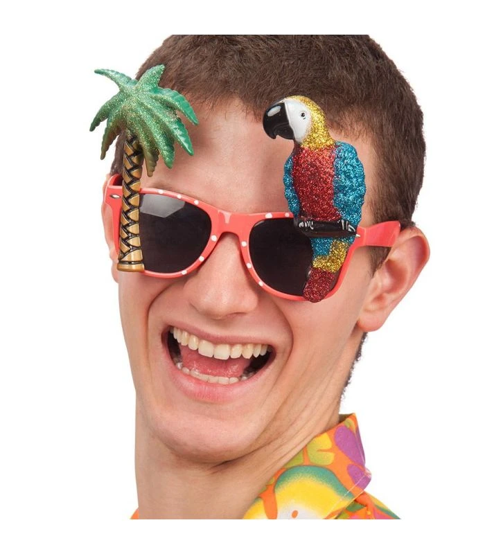 Occhiali originali e divertenti decorati con una palma e un pappagallo per sembrare un turista appena tornato da un fantastico viaggio alle Hawaii.