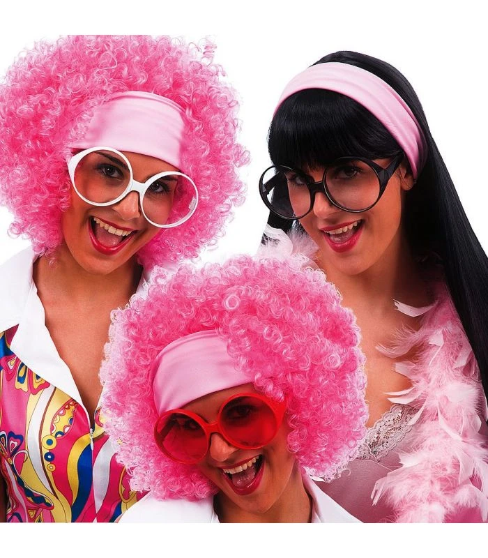 Occhiali colorati dalla montatura grande e tonda, nei colori bianco, rosso, nero assortiti; accessorio ideale per le serate in discoteca.