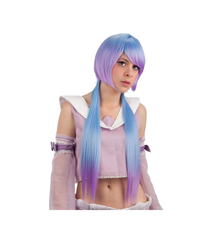 parrucca azzurra e viola lunghissima con codini e frangia effetto naturale con calotta regolabile e messa in piega personalizzabile .. utile per travestimenti stile manga per i cosplay e per le fiere di lucca comics e romics ..