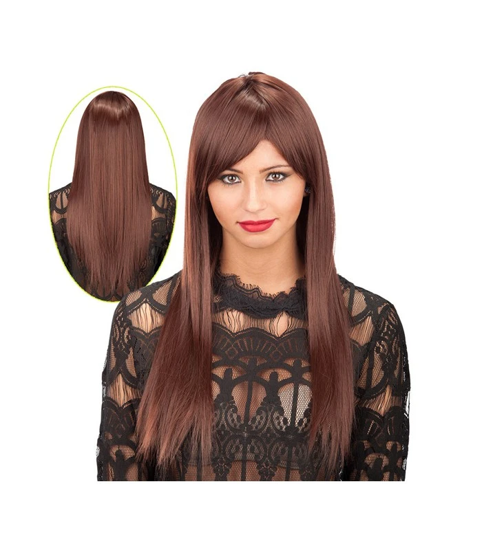 parrucca castana liscia lunga con frangia con messa in piega personalizzabile e calotta regolabile … adatta per i travestimenti e per le feste di carnevale ..