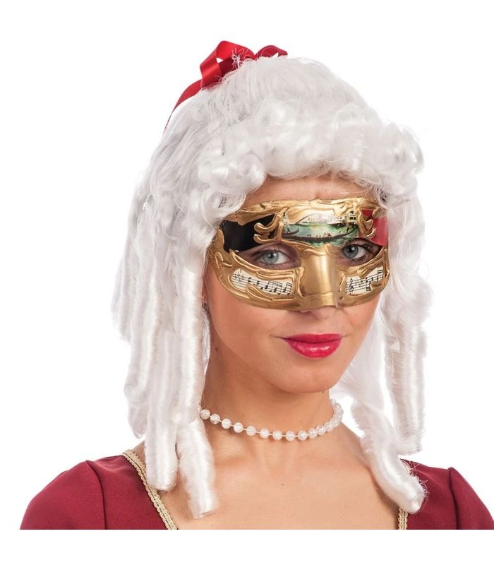 Parrucca damina bianca con nastrino rosso e boccoli. Retina elasticizzata. Taglia unisex. Stile anno ‘700. Adatta per feste in maschera, feste a tema e Carnevale.