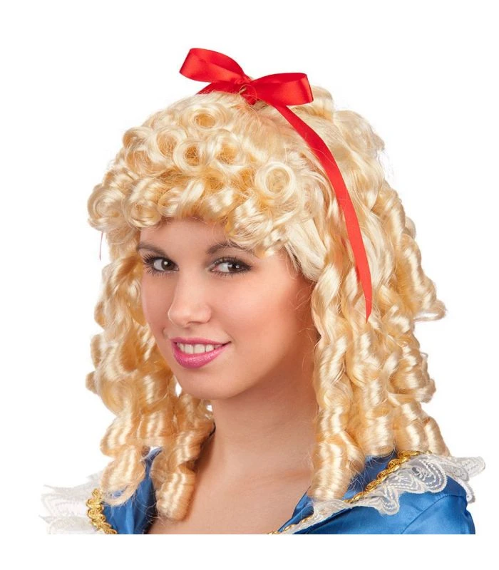 Parrucca damina bionda anni ‘700 ( bimba ), con nastro rosso e boccoli. Retina elasticizzata all’inerno. Taglia unisex. Ideale per feste in maschera e Carnevale.