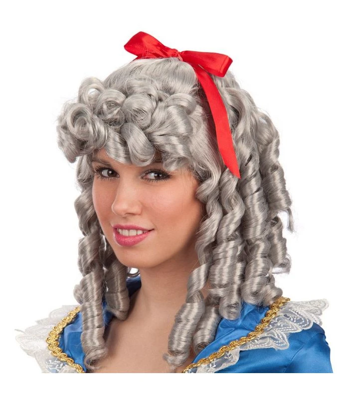 Parrucca damina grigia con boccoli e nastrino rosso anni ‘700, retina elasticizzata. Taglia unisex. Ideale per feste in maschera, feste a tema e Carnevale.