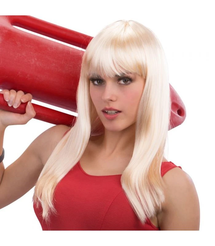Parrucca lunga liscia bionda frangia, con retina elasticizzata. Taglia unica da donna. Adatta per feste a tema, feste in maschera e Carnevale.