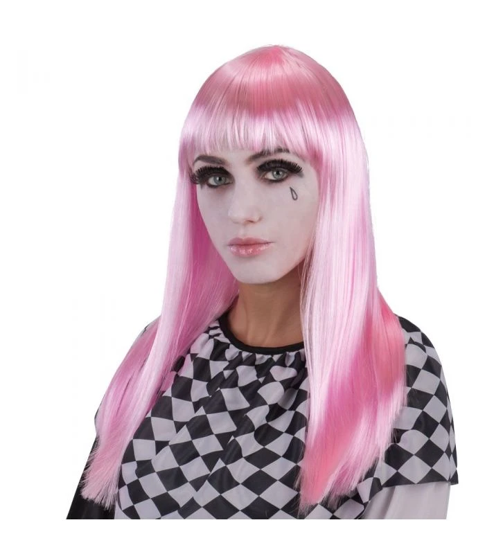Parrucca lunga liscia rosa frangia, con retina elasticizzata. Taglia unisex. Adatta per feste a tema, feste in maschera, Carnevale ed Halloween.