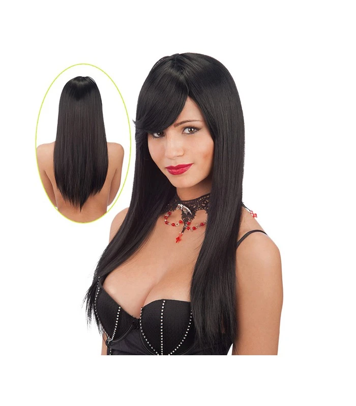 parrucca nera liscia lunga e con frangia , messa in piega personalizzabile e con calotta regolabile .. utile per le feste a tema , per i travestimenti di carnevale e non solo ..