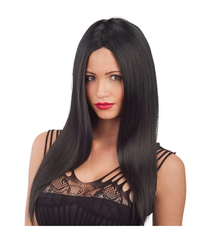 Parrucca nera liscia lunga, con retina elasticizzata. Taglia unica da donna. Adatta per festa in maschera, feste a tema e Halloween.