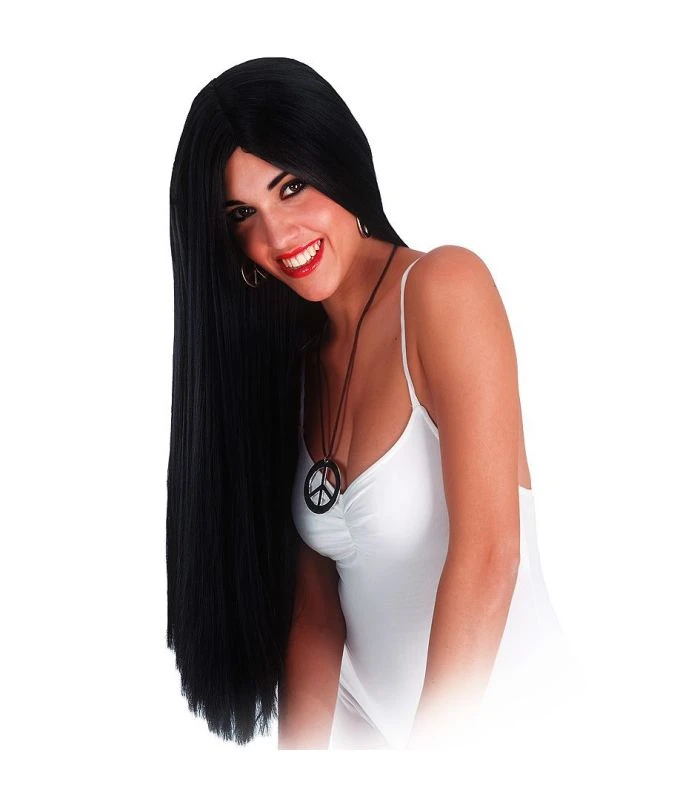 Parrucca nera lunghissima, con retina elasticizzata. Taglia unisex. Adatta per feste in maschera, feste a tema e Carnevale. Ideale per una bellissima principessa orientale.