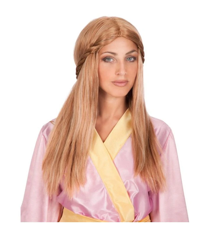 Parrucca principessa biondo scuro con due trecce e riga centrale. Adatta per un travestimento genere fantasy o medievale. Ideale per essere un vera principessa.