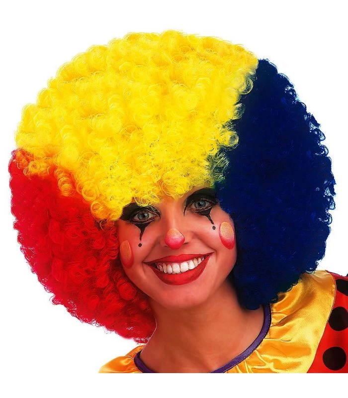 Parrucca super ricciolona 3 colori blu, giallo e rosso. Adatta per feste di Carnevale. Ideale per un simpaticissimo clown.
