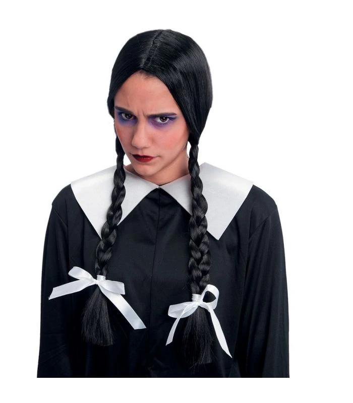 Parrucca Mercoledi Addams con treccie, retina elasticizzata. Taglia unica da donna. Adatta per feste a tema, feste in maschera e Halloween. Ideale per interpretare al meglio la giovane figlia tenebrosa della famiglia Addams.