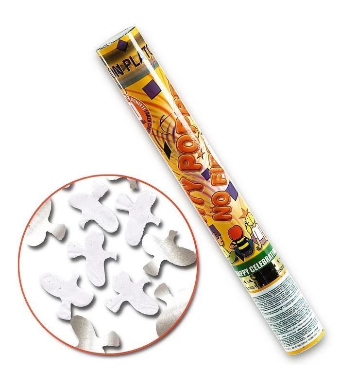 Tubo spara coriandoli a forma di colombe bianche con meccanismo ad aria compressa, altezza cm.50. Adatto per festeggiare matrimoni ed eventi parrocchiali.